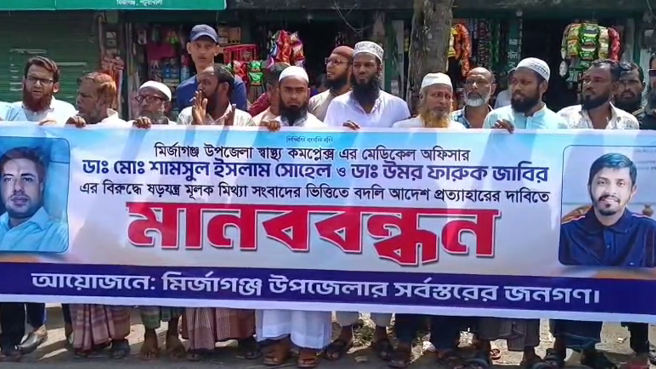 পটুয়াখালীতে দুই চিকিৎসকের বদলি প্রত্যাহার দাবিতে সড়ক অবরোধ