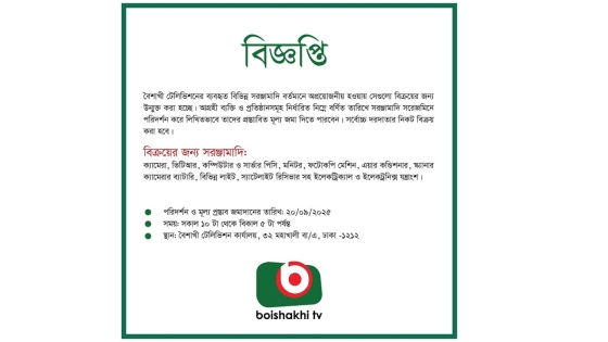 বৈশাখী টেলিভিশনে ব্যবহৃত বিভিন্ন সরঞ্জামাদি বর্তমানে অপ্রয়োজনীয় হওয়ায় সেগুলো বিক্রির জন্য উন্মুক্ত করা হয়েছে। আগ্রহি ব্যক্তি ও প্রতিষ্ঠান কর্তৃপক্ষকে নির্ধারিত নিম্ন বর্ণিত তারিখে সরঞ্জামাদি সরেজমিনে পরিদর্শন করে লিখিতভাবে তাদের প্রস্তাবিত মূল্য জমা দিতে পারবেন। সর্বোচ্চ দরতার কাছে ওইসব সরঞ্জামাদি বিক্রি করা হবে।