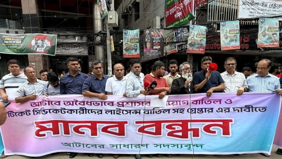 বাংলাদেশ অ্যাসোসিয়েশন অব ট্রাভেল এজেন্টস অব বাংলাদেশ (আটাব)-এ প্রশাসক নিয়োগের প্রতিবাদে এবং নিয়োগ বাতিলের দাবিতে মানববন্ধন করেছেন সংগঠনটির সাধারণ সদস্যরা।
