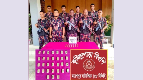 শনিবার (২৬ জুলাই) ভোর সাড়ে ৫টার দিকে উপজেলার মহেশপুর সীমান্তের কুমিল্লাপাড়া বিওপি এলাকায় অভিযান চালিয়ে এসব স্বর্ণের বার উদ্ধার করা হয়। উদ্ধারকৃত স্বর্ণের বারের ওজন ৪ কেজি ২০৩ দশমিক ১১ গ্রাম। যার আনুমানিক বাজারমূল্য প্রায় ৫ কোটি ৮৩ লাখ ৩ হাজার ৬১৮ টাকা। দুপুর দেড়টার দিকে মহেশপুর ব্যাটালিয়ন (৫৮ বিজিবি) ব্যাটেলিয়নের সহকারী পরিচালক ও ভারপ্রাপ্ত কোয়ার্টার মাস্টার মুন্সি ইমদাদুর রহমানের পাঠানো প্রেস বিজ্ঞপ্তিতে এ তথ্য জানানো হয়।