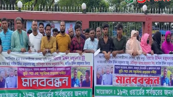 ফেনী পৌরসভার ১৮ নম্বর ওয়ার্ডে চাঁদাবাজি, সন্ত্রাস, জবরদখল ও মিথ্যা মামলার অত্যাচারে অতিষ্ঠ হয়ে এলাকাবাসী মানববন্ধন করেছেন।