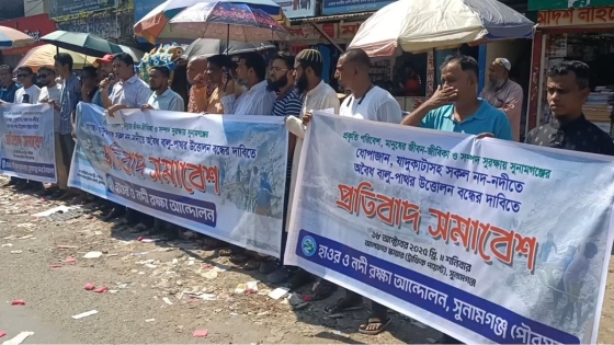 সুনামগঞ্জে প্রকৃতি ও মানুষের জীবন জীবিকার সুরক্ষায় ধোপাজান ও যাদুকাটা সহ সকল নদ-নদীতে অবৈধভাবে বালু পাথর উত্তোলন বন্ধের দাবিতে মানববন্ধন অনুষ্ঠিত হয়েছে।