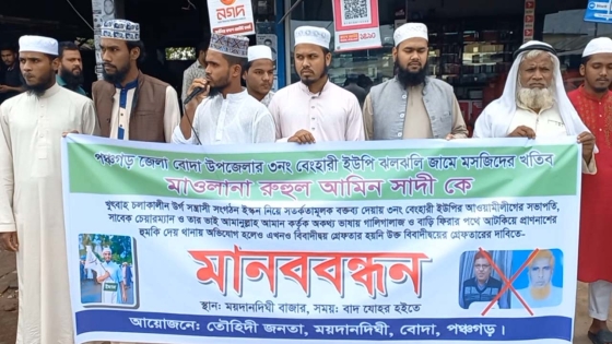 আজ সোমবার (২৭ অক্টোবর) দুপুরে তৌহিদী জনতার ব্যানারে বোদা উপজেলার ময়দানদিঘী বাজারে পঞ্চগড়-ঢাকা জাতীয় মহাসড়কের পাশে দাড়িয়ে ঘন্টাব্যাপী এই কর্মসূচী পালন করেন তারা।মানববন্ধনে বক্তারা বলেন, গত ২৪ অক্টোবর (শুক্রবার) জুম্মার নামাজের আগে খতিব মাওলানা রুহুল আমিন সাদী ইস্কন নিয়ে সতর্কতামূলক বক্তব্য দেন। এর পর আবুল কালাম আজাদ আবু ও তার ভাই আমানুল্লাহ আমান খতিবকে অকথ্য ভাষায় গালিগালাজ করেন এবং বাড়ি ফেরার পথে তাকে আটকিয়ে প্রাণনাশের হুমকি দেন।