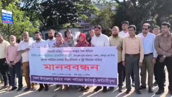 বৃহস্পতিবার (৬ নভেম্বর) দুপুরে নকলা উপজেলা পরিষদের সামনে এ মানববন্ধন অনুষ্ঠিত হয়। মানববন্ধন শেষে তারা ঢাকা ময়মনসিংহ মহাসড়কেও অবস্থান নেন ।
