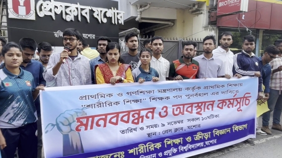 প্রাথমিক বিদ্যালয়ে শারীরিক শিক্ষা ও সংগীত শিক্ষক পদ বাতিলের প্রতিবাদে যশোর বিজ্ঞান ও প্রযুক্তি বিশ্ববিদ্যালয়ের শিক্ষার্থীদের আয়োজনে মানববন্ধন অনুষ্ঠিত হয়েছে।